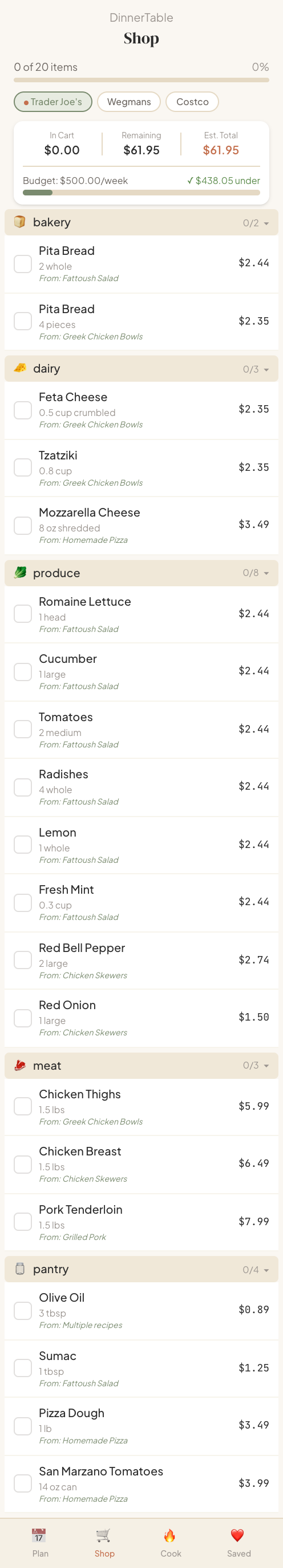 Auto-generated and organized by aisle. Ingredients merged across every recipe in the week, priced by your preferred store. Tap to check off as you shop.