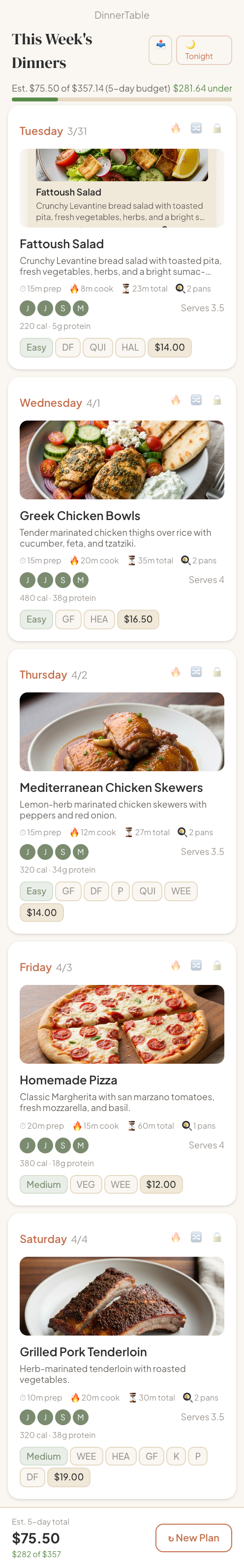A new week of dinners every Monday, tailored to your family's tastes, dietary needs, and budget. Swap anything you don't love. No repeats within a plan.
